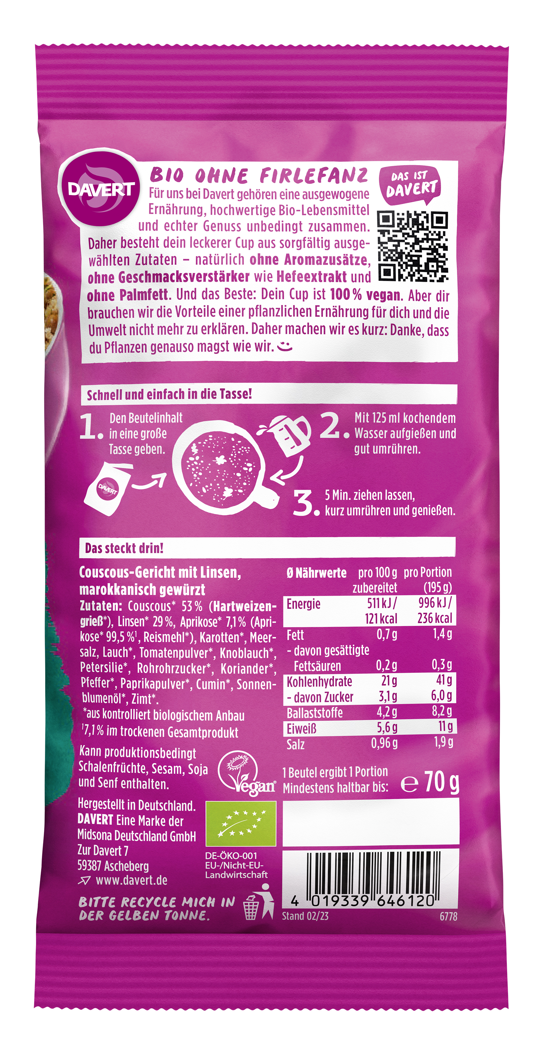 Couscous* 53% (HARTWEIZENGRIEß*), Linsen* 29%, Aprikose* (Aprikose*, Reismehl*), Karotte*, Meersalz, Lauch*, Tomate*, Knoblauch*, Petersilie*, Rohrohrzucker*, Koriander*, Pfeffer*, Paprika*, Cumin*, Sonnenblumenöl*, Zimt*.