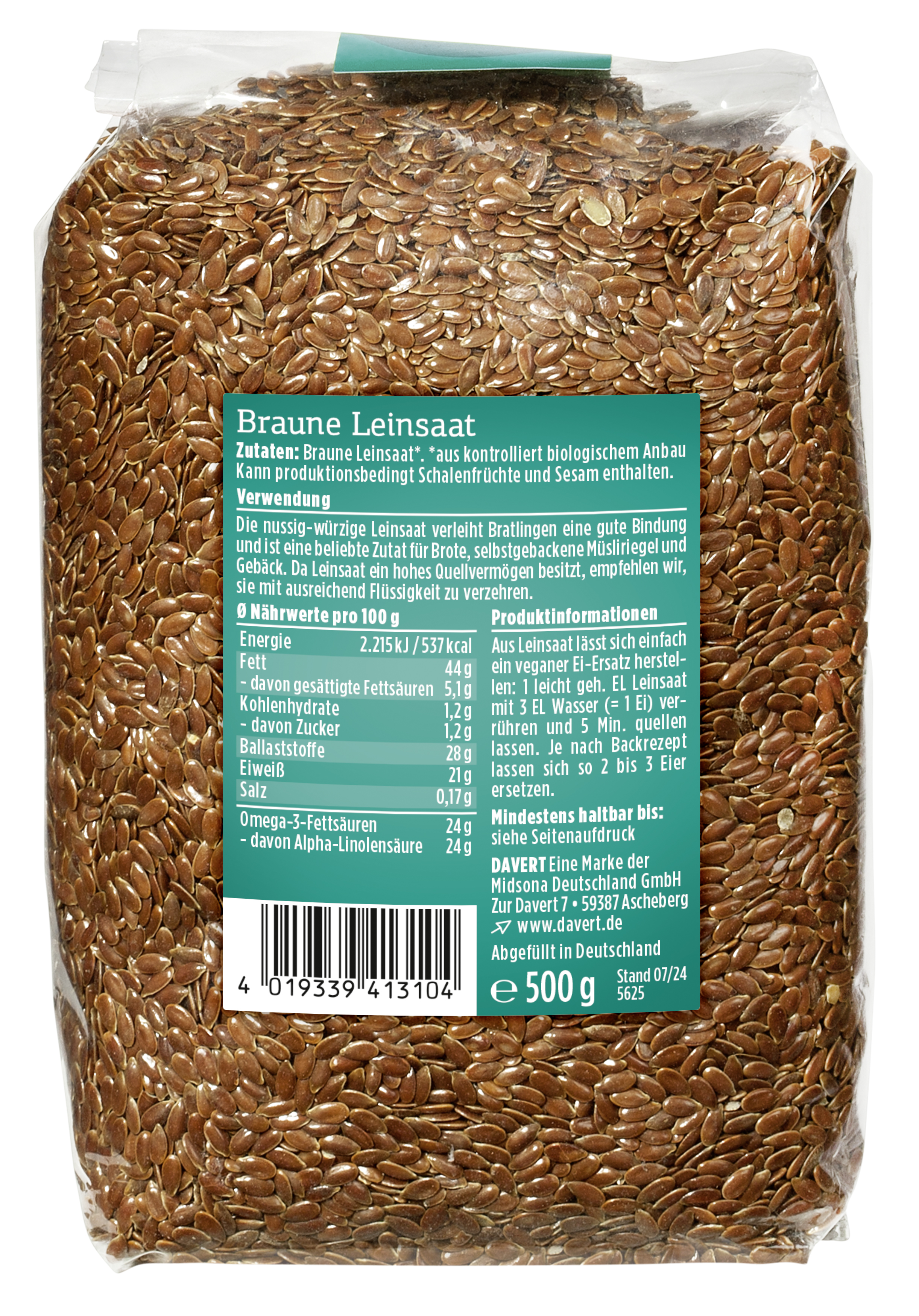 Die nussig-würzige Leinsaat verleiht Bratlingen eine gute Bindung und ist eine beliebte Zutat für Brote, selbstgebackene Müsliriegel und Gebäck. Da Leinsaat ein hohes Quellvermögen besitzt, empfehlen wir,
