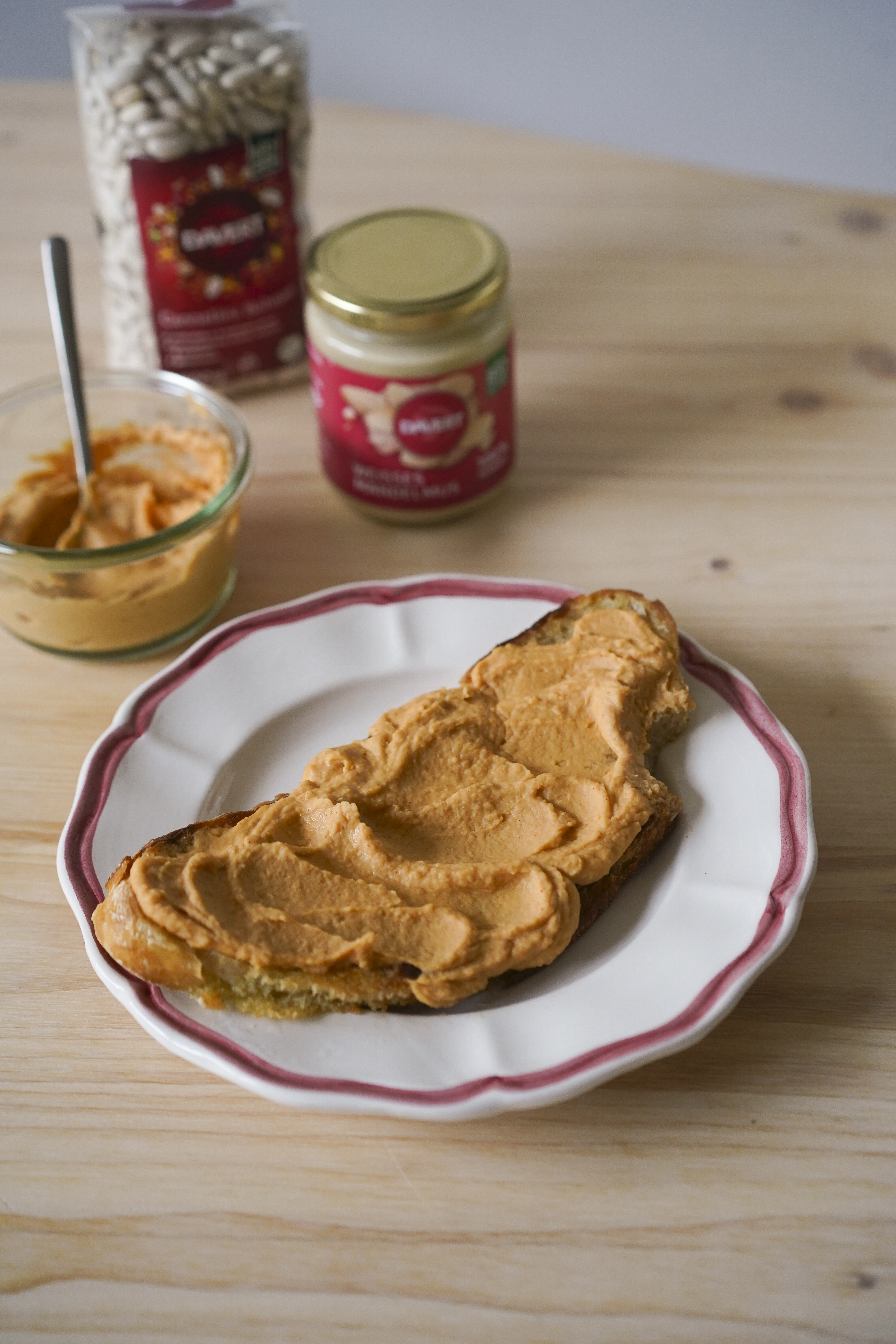 4. Konsistenz anpassen: Nach Bedarf etwas Wasser oder mehr Öl zugeben, bis der Aufstrich seidig wird.