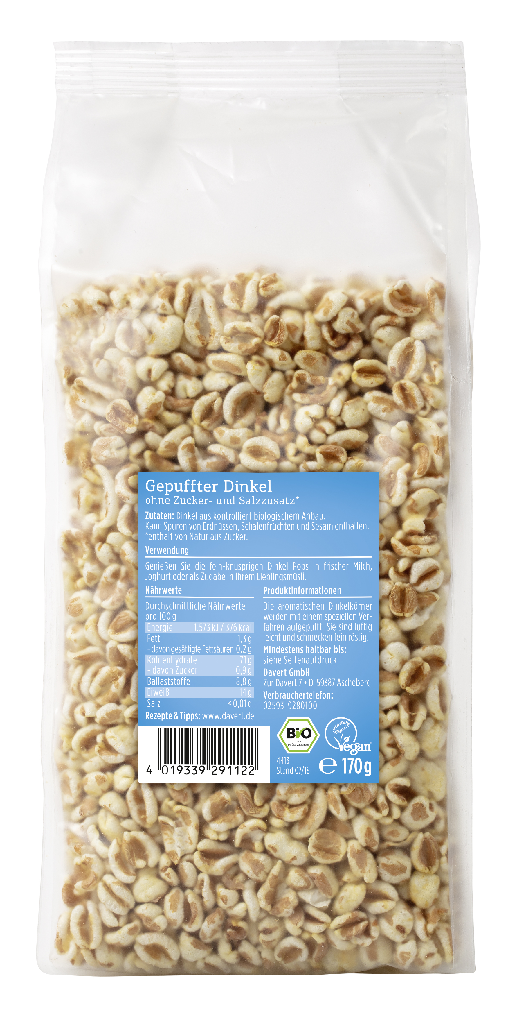 Die aromatischen Dinkelkörner werden mit einem speziellen Verfahren aufgepufft. Sie sind luftig leicht und schmecken fein röstig.