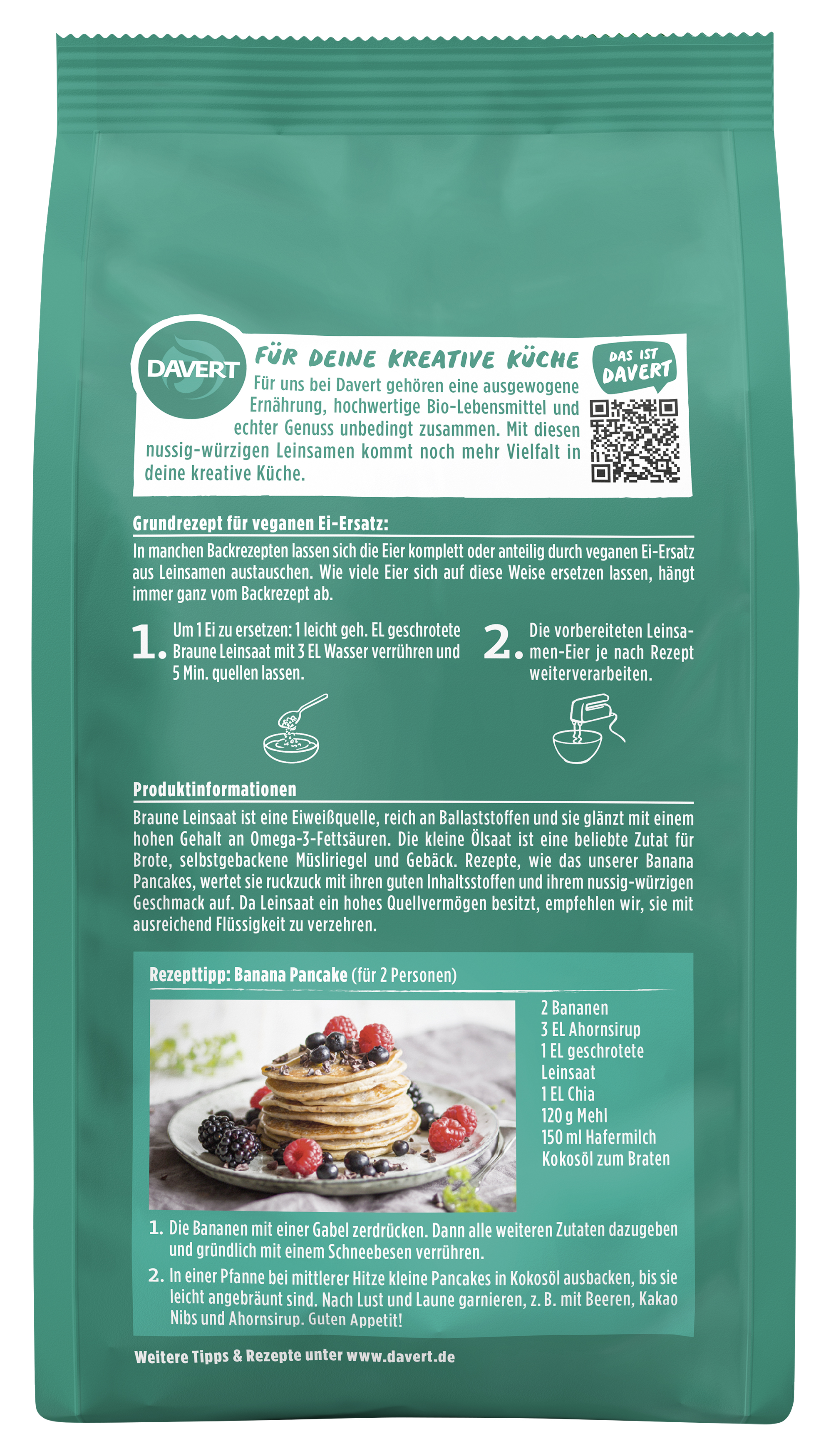Braune Leinsaat ist eine Eiweißquelle, reich an Ballaststoffen und sie glänzt mit einem hohen Gehalt an Omega-3-Fettsäuren. Die kleine Ölsaat ist eine beliebte Zutat für Brote, selbstgebackene Müsliriegel und Gebäck. Rezepte, wie das unserer Banana Pancakes, wertet sie ruckzuck mit ihren guten Inhaltsstoffen und ihrem nussig-würzigen Geschmack auf. Da Leinsaat ein hohes Quellvermögen besitzt, empfehlen wir, sie mit ausreichend Flüssigkeit zu verzehren.