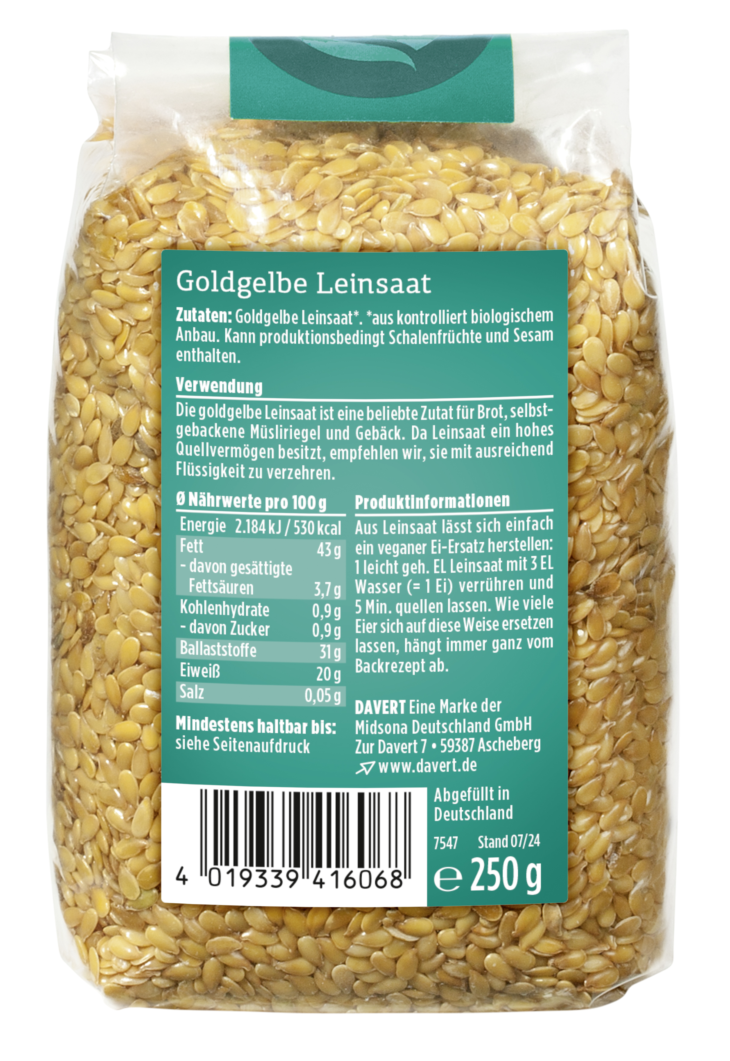 Die goldgelbe Leinsaat ist eine beliebte Zutat für Brot, selbstgebackene Müsliriegel und Gebäck. Da Leinsaat ein hohes Quellvermögen besitzt, empfehlen wir, sie mit ausreichend Flüssigkeit zu verzehren.