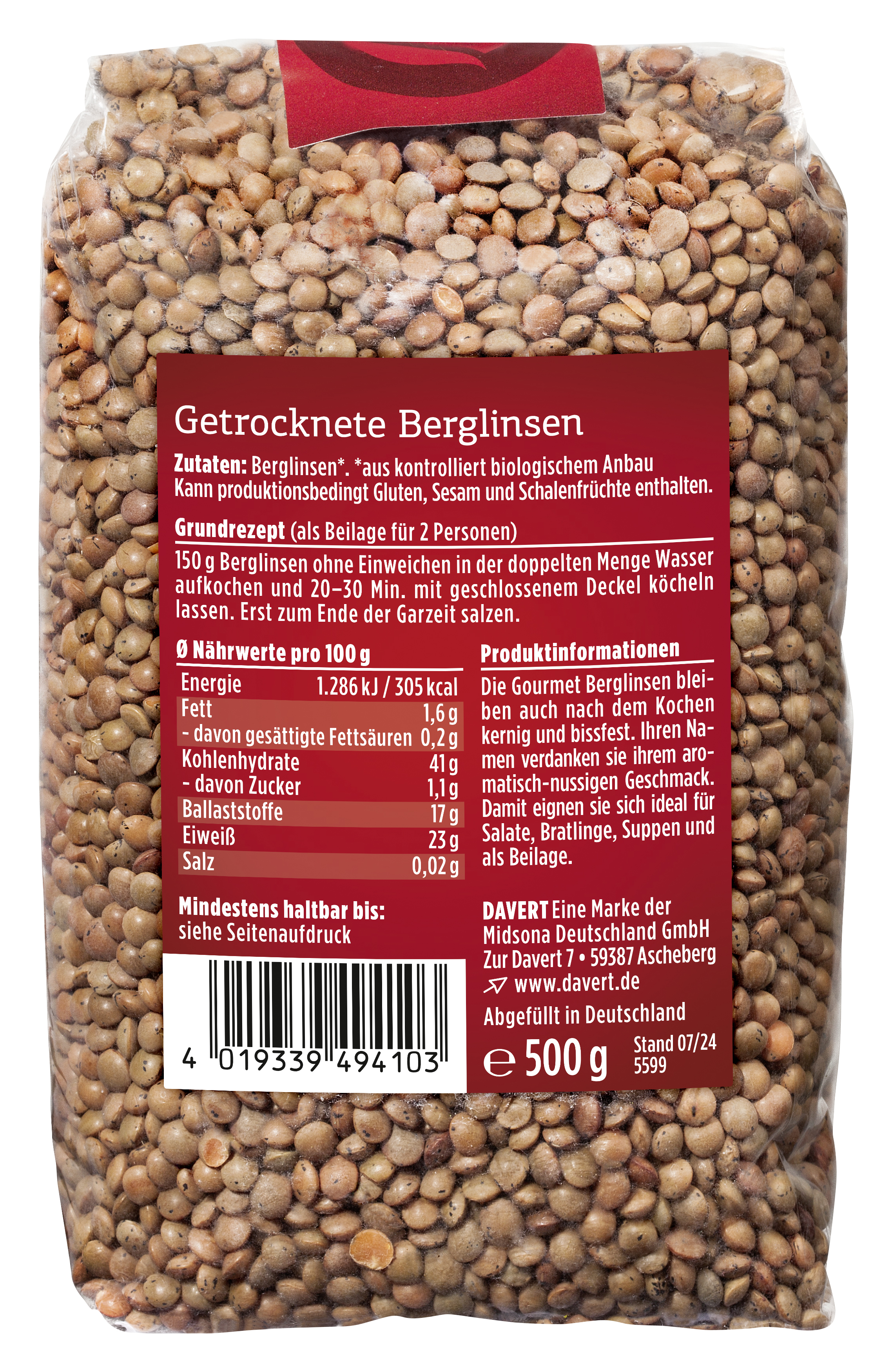 Die Gourmet Berglinsen bleiben auch nach dem Kochen kernig und bissfest. Ihren Namen verdanken sie ihrem aromatisch-nussigen Geschmack. Damit eignen sie sich ideal für Salate, Bratlinge, Suppen und als Beilage.