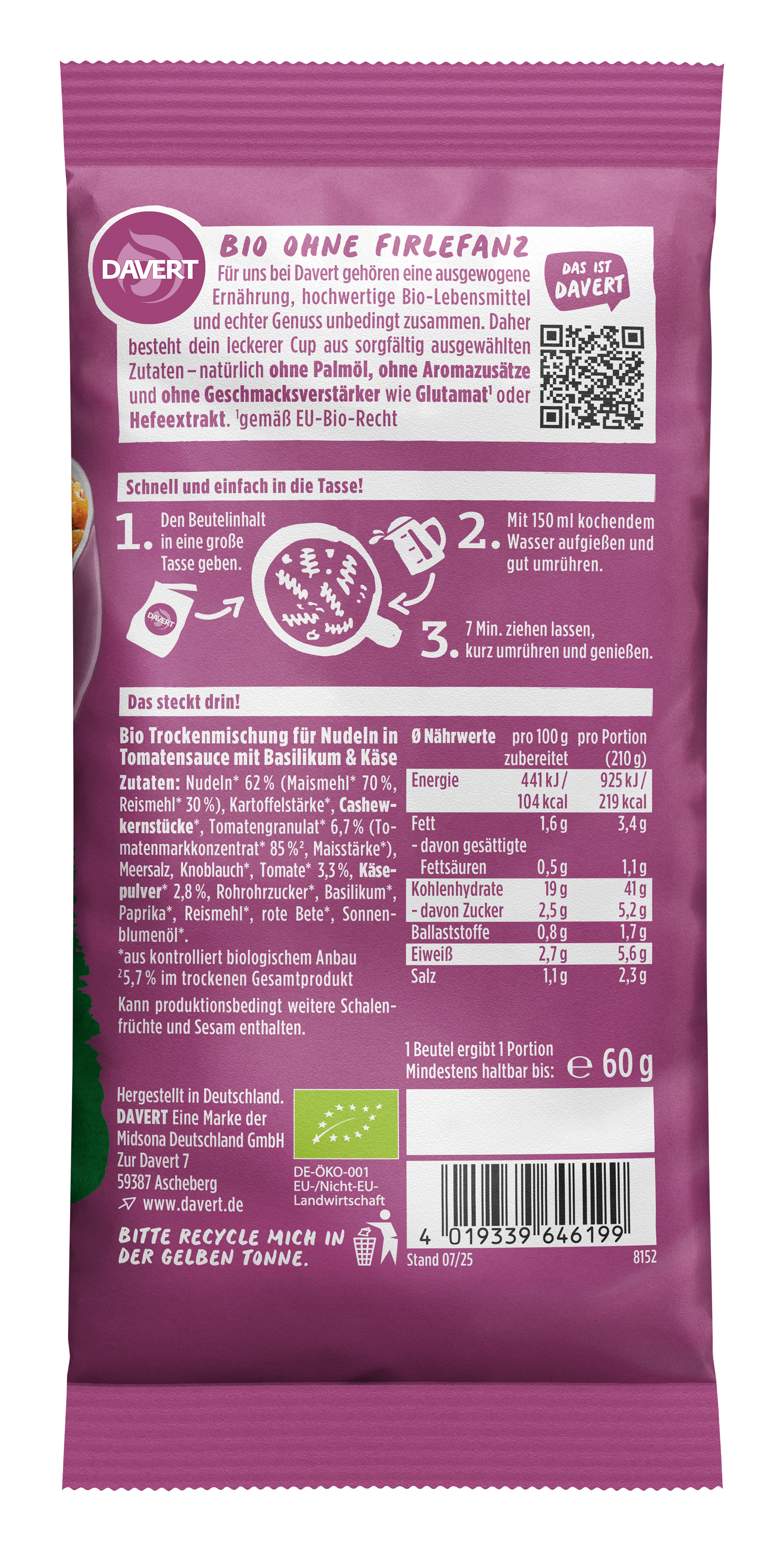 Den Beutelinhalt in eine große Tasse geben. Mit 150 ml kochendem Wasser aufgießen und gut umrühren. 7 Minuten ziehen lassen, kurz umrühren und genießen.