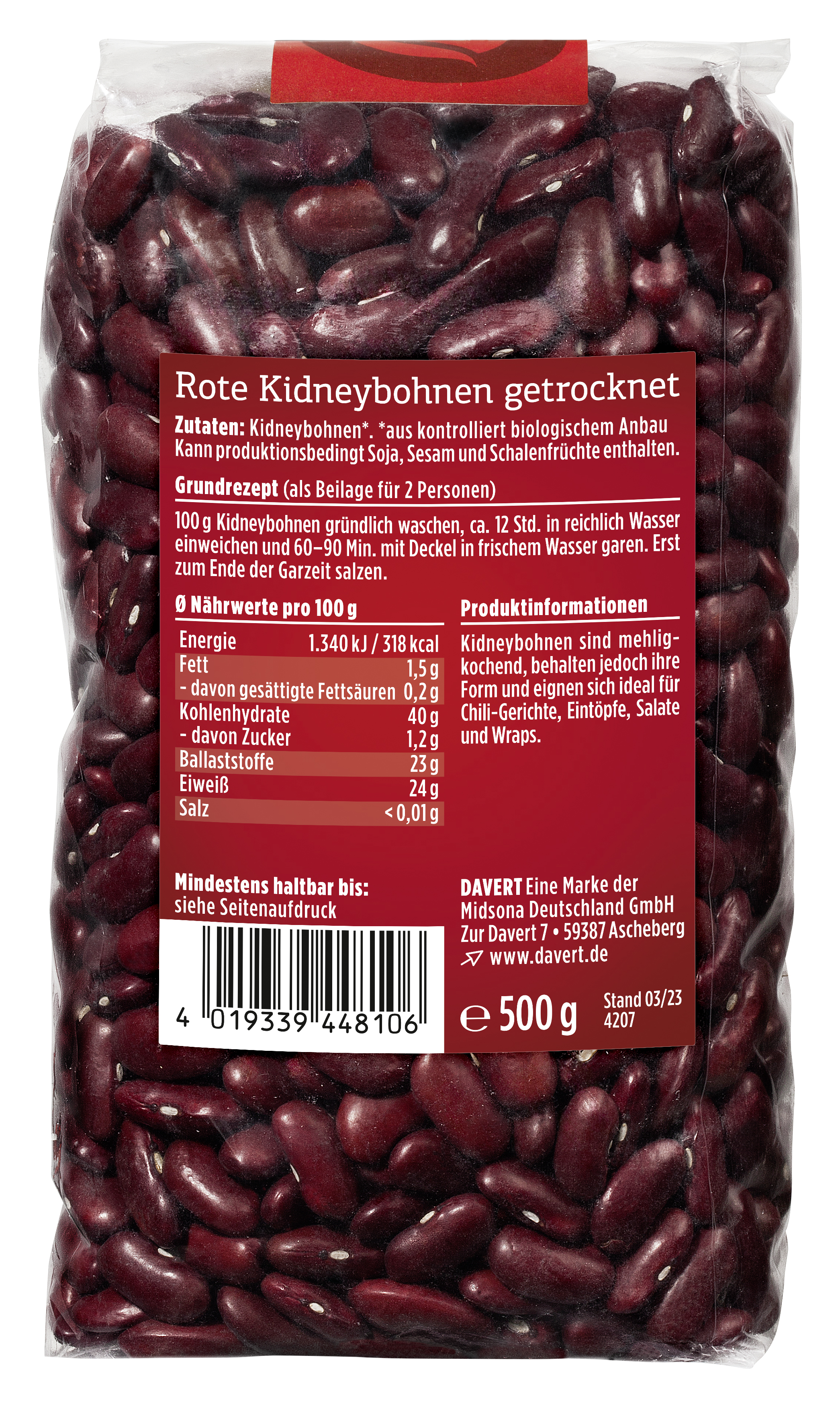 Entdecke unsere herzhaften roten Kidneybohnen – die ideale Basis für köstliche und nahrhafte Gerichte! Mit ihrer festen Textur und ihrem reichhaltigen Geschmack verleihen diese Bohnen deinen Mahlzeiten eine unwiderstehliche Würze. Ob in Suppen, Eintöpfen, Chili non Carne oder als proteinreiche Zutat in Salaten. Reich an Ballaststoffen & pflanzlichen Eiweißen, eignen sie sich ideal für eine ausgewogene vegetarische Ernährung.