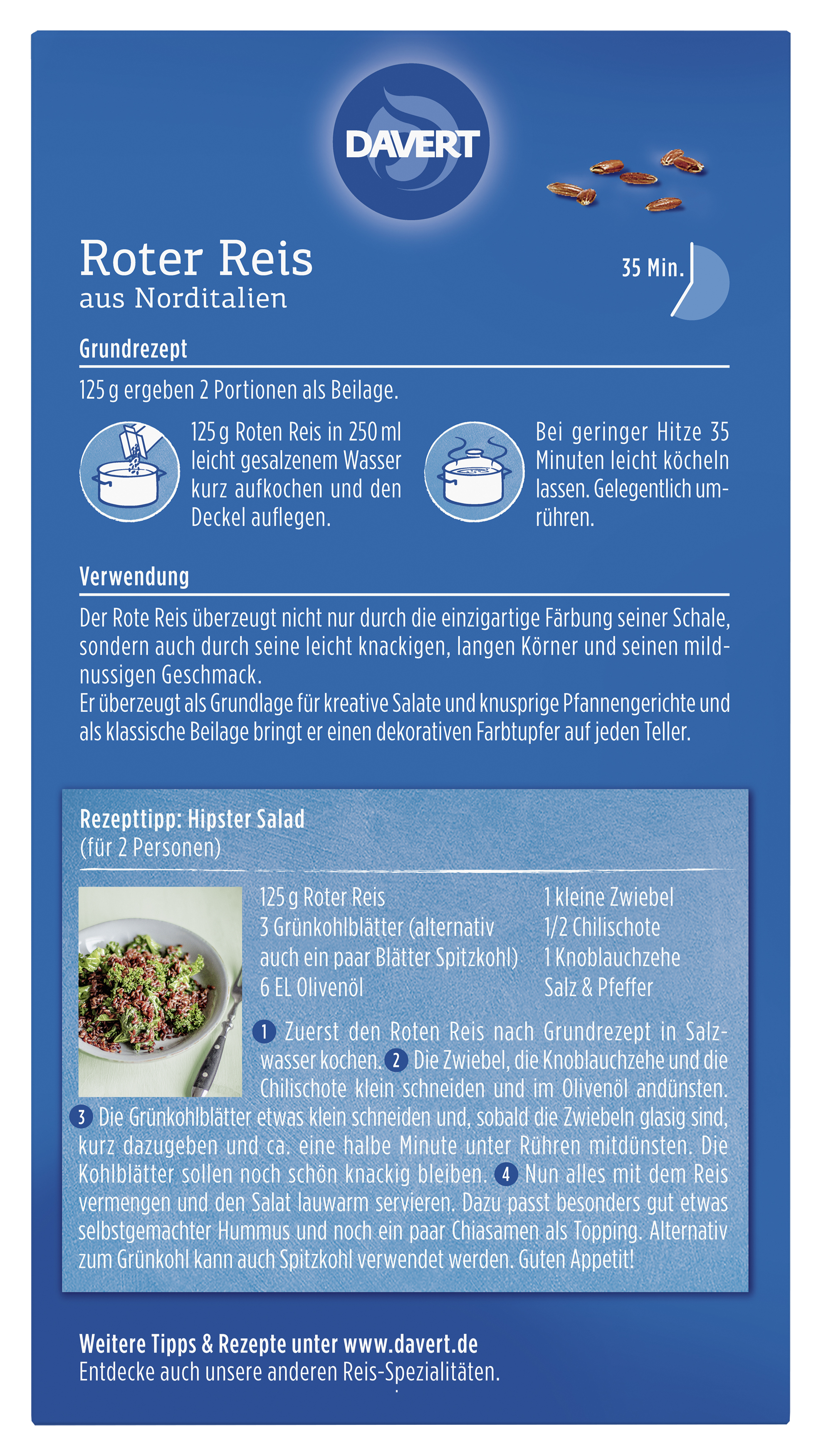 Als Beilage für 2 Personen 125g Roter Reis in 250ml leicht gesalzenem Wasser aufkochen und 35 Minuten leicht köcheln lassen.