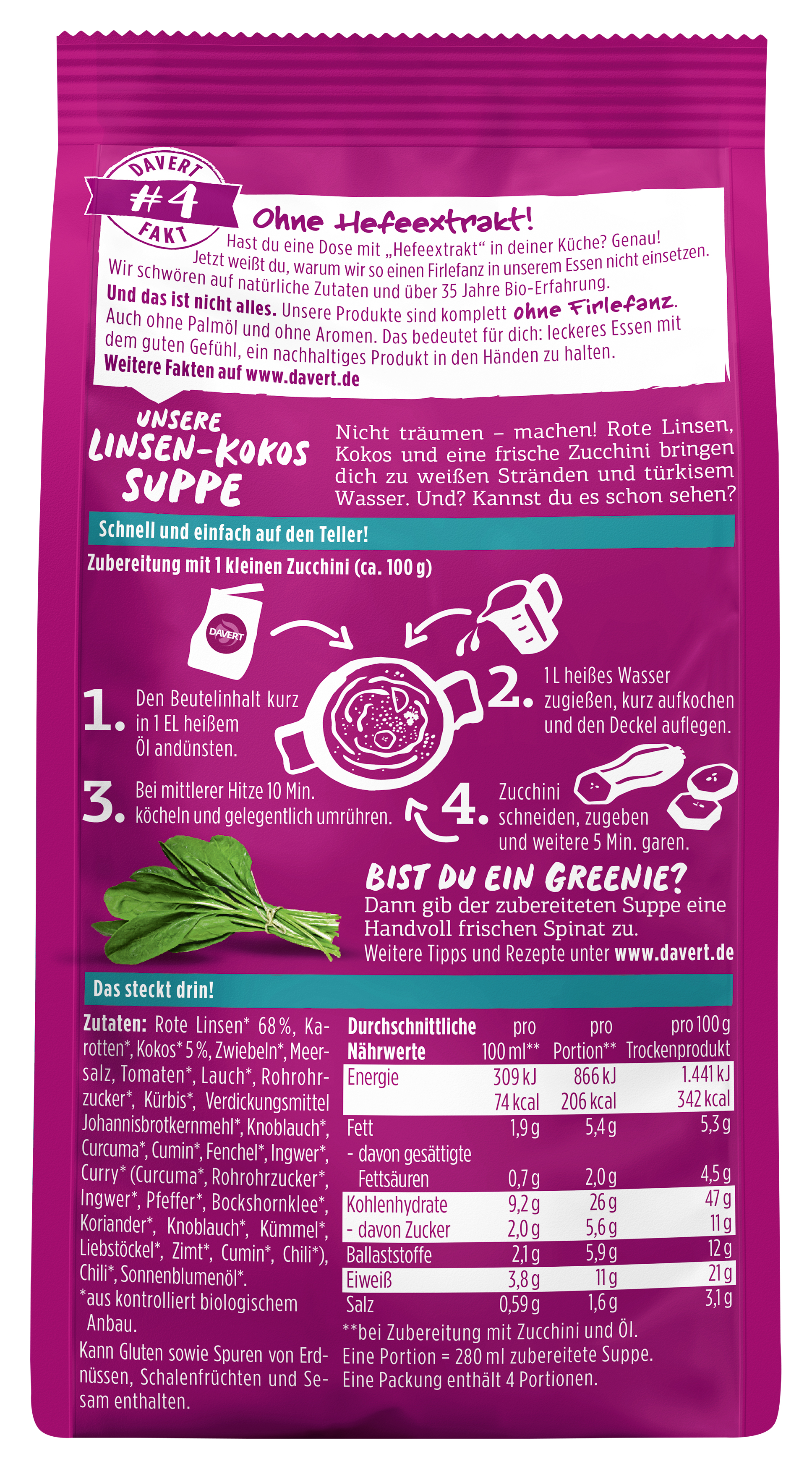 Hast Du eine Dose mit “Hefeextrakt” in deiner Küche? Genau! Jetzt weißt Du, warum wir so einen Firlefanz in unserem Essen nicht einsetzen. Wir schwören auf natürliche Zutaten und über 35 Jahre Bio-Erfahrung.